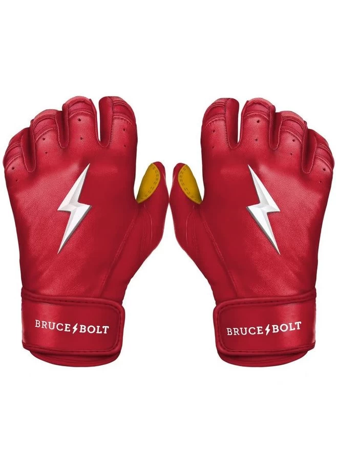HIGHEST QUALITY, MOST DURABLE BATTING GLOVE IN BASEBALL: Each pair of BRUCE BOLT batting gloves are handmade by skilled craftsmen using only the highest quality 0.9mm Cabretta leather and stitching techniques which makes our gloves buttery soft but more durable than any other glove on the market.